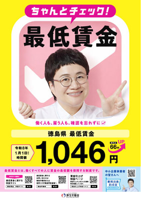 令和7年度徳島県最低賃金額の改定について 2025年10月20日 行政からのお知らせ 徳島県内で働く全ての労働者に適用される徳島県最低賃金について、時間額1,046円(現行金額より66円引上げ)に改正し、令和8年1月1日(木)から効力が発生することとなります。以下に添付のリーフレットをご確認ください。