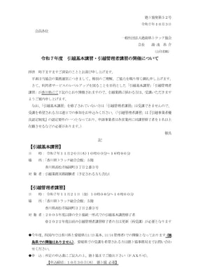 令和7年度 引越基本講習・引越管理者講習の開催について 2025年10月 6日 引越利用者へのサービスのレベルアップを図ることを目的とした「引越基本講習」「引越管理者講習」が香川県にて開催されます(今年度は徳島県での開催はありません)。受講を希望される方は、以下の申込書をご記入の上、徳ト協まで持参・郵送またはメールにてご提出ください。 ・ 引越基本講習(申込書兼受講票)・引越管理者講習(申込書兼受講票)