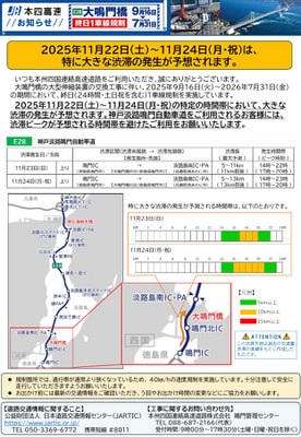 2025年11月22日(土)~11月24日(月・祝)の特定の時間帯において、大きな渋滞の発生が予想されます。神戸淡路鳴門自動車道をご利用されるお客様には、渋滞ピークが予想される時間帯を避けたご利用をお願いいたします。
