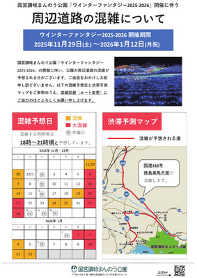 国営讃岐まんのう公園「ウインターファンタジー 2025-2026」開催に伴う周辺道路の混雑について 2025年11月14日 その他のお知らせ 国営讃岐まんのう公園「ウインターファンタジー2025-2026」の開催に伴い、公園の周辺道路が混雑する日があります。以下のチラシの混雑予想日と渋滞予測マップをご参照のうえ、 混雑回避(ルート変更)にご協力ください。