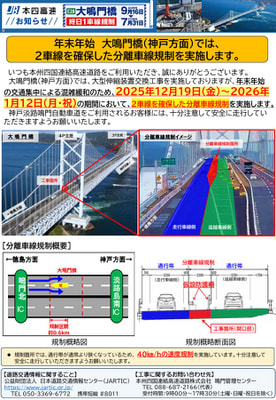 年末年始 大鳴門橋(神戸方面)で、2車線を確保した分離車線規制を実施 2025年12月 3日 その他のお知らせ 大鳴門橋(神戸方面)では、大型伸縮装置交換工事が実施されていますが、年末年始の交通集中による混雑緩和のため、2025年12月19日(金)~2026年1月12日(月・祝)の期間において、2車線を確保した分離車線規制が実施されます。規制区間においては、40km/hの速度規制が実施されますので、十分注意して安全に走行していただきますようお願いいたします。 E28 神戸淡路鳴門自動車道 交通規制のお知らせ | JB本四高速